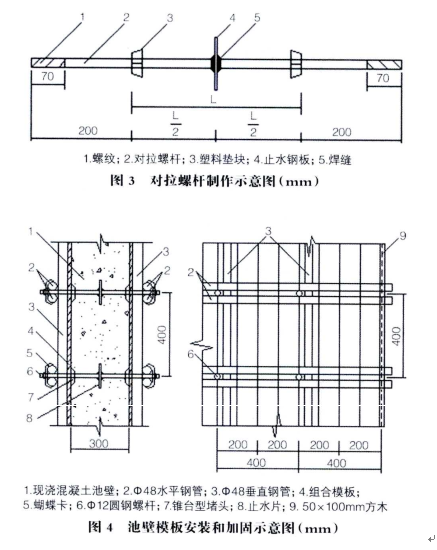 安裝池壁模板至設(shè)汁標(biāo)高,用對拉螺桿加固;按照設(shè)計要求進(jìn)行整體找平、校正后擰緊所有螺桿的螺帽;模板所有接縫緊密不漏漿、小錯位。模板支撐系統(tǒng)采用Φ48x3.5鋼管,用對拉圓螺桿和蝴蝶卡固定,模板按400mm×400nlm分布對拉圓鋼螺桿。拆模后拆下螺桿兩頭錐臺型堵頭,將螺桿沿堵頭預(yù)留的凹坑底割除,再用防水水泥砂漿抹平模板安裝和加固如圖4所示。